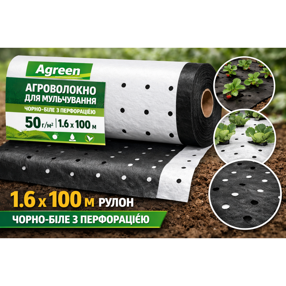 Агроволокно для мульчування Agreen 50 г/м² чорно-біле з перфорацією (1.6×100 м) — зручна посадка та ефективний контроль бур’янів