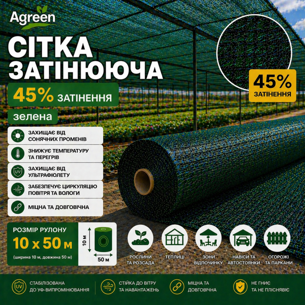 Сітка затіняюча Agreen 45% зелена підходить для теплиць, парників, розсадників, молодих рослин, навісів, огорож, садових ділянок, фермерських господарств та великих аграрних територій. Це ефективне рішення для помірного затінення та захисту рослин.
