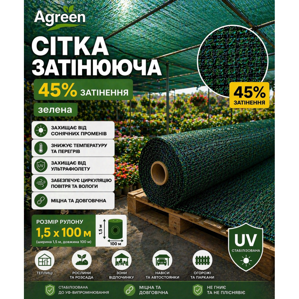 Сітка затіняюча Agreen 45% зелена підходить для теплиць, парників, розсадників, молодих рослин, навісів, огорож, садових ділянок та фермерських господарств. Це ефективне рішення для помірного затінення та захисту рослин.