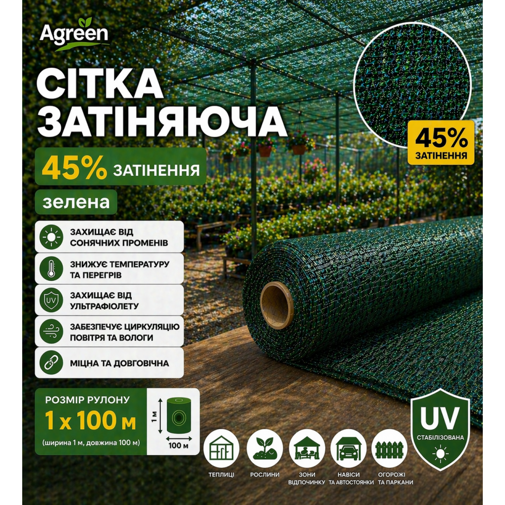 Сітка затіняюча Agreen 45% зелена (Рулон 1х100)