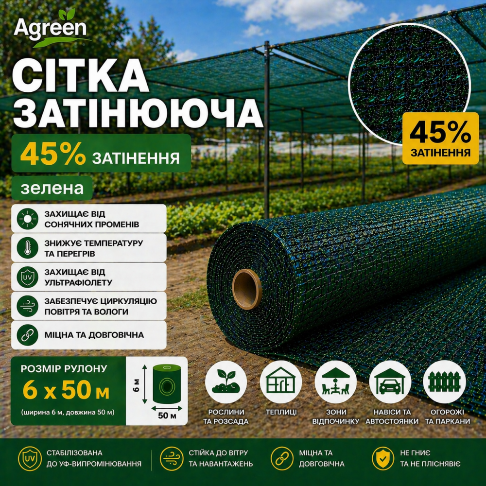 Сітка затіняюча Agreen 45% зелена (Рулон 6х50)