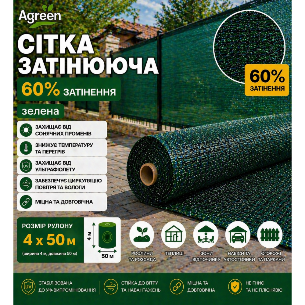 Сітка затіняюча Agreen 60% зелена — міцний і практичний матеріал для створення комфортної тіні, захисту рослин від інтенсивного сонячного випромінювання, перегріву та пересихання ґрунту. Рівень затінення 60% забезпечує оптимальний мікроклімат, знижує температуру під накриттям і допомагає зберігати вологу в ґрунті. Це чудове рішення для теплиць, розсадників, навісів, огорож, терас і садових ділянок. Рулон розміром 4x50 м підходить для накриття середніх і великих площ без зайвих стиків.