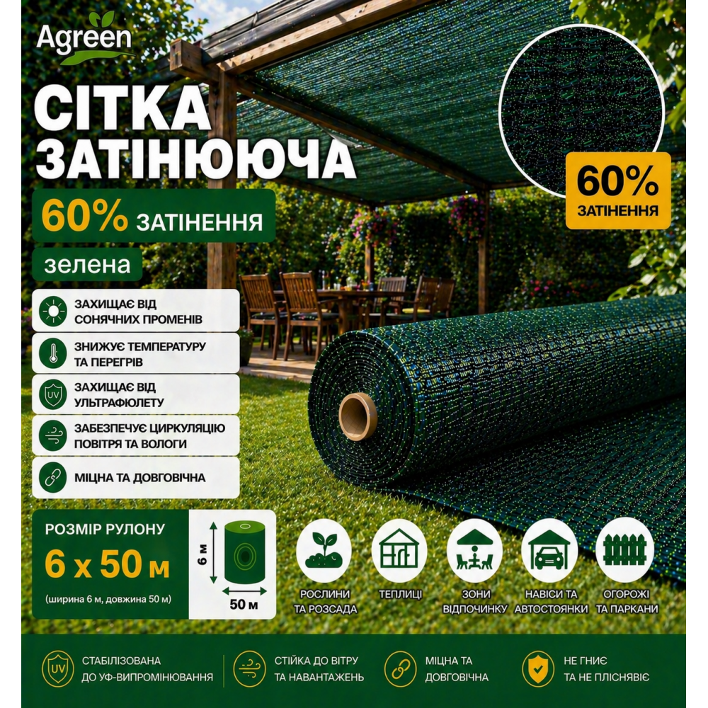 Сітка затіняюча Agreen 60% зелена (Рулон 6x50)