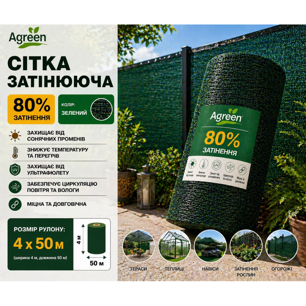 Сітка затіняюча Agreen 80% зелена — щільний та міцний матеріал для створення інтенсивної тіні, захисту рослин від палючого сонця, перегріву та швидкого пересихання ґрунту. Рівень затінення 80% забезпечує максимальний затінювальний ефект, суттєво знижує температуру під накриттям і створює комфортний мікроклімат для чутливих культур. Це чудове рішення для теплиць, розсадників, навісів, огорож, терас, альтанок та садових територій. Рулон розміром 4x50 м зручний для накриття середніх і великих площ без зайвих стиків.