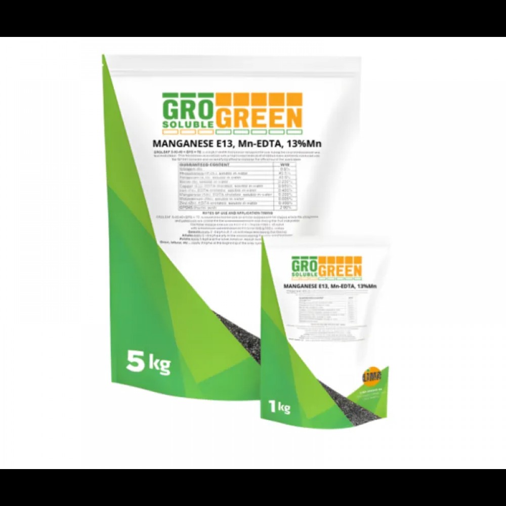 GroGreen МАРГАНЕЦ 13% (Mn-EDTA) — высокоэффективный водорастворимый хелат марганца с содержанием 13% Mn в форме EDTA. Предназначен для обеспечения растений марганцем, стимуляции роста и развития, улучшения фотосинтеза и метаболизма.